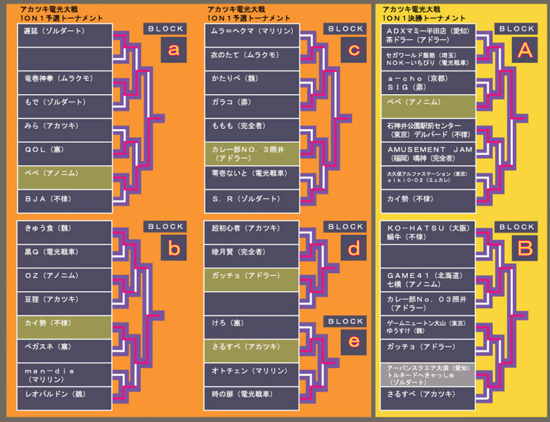 予選トーナメントは前日の3on3で怒涛の6人抜きでチームを優勝に導いた「oz」や、他のあらゆる格ゲーでその名を轟かせ電光戦車の恐怖を叩き込む「時の扉」が敗退しつつも「ペペ」「カイ勢」「カレー部NO.3照井」「ガッチョ」「さるすべ」の5人が決勝トーナメント出場権を獲得した。
