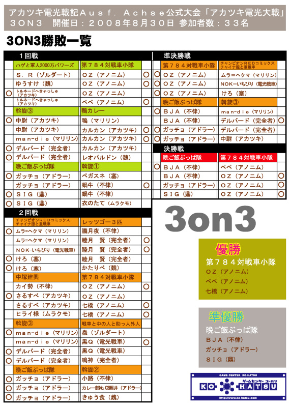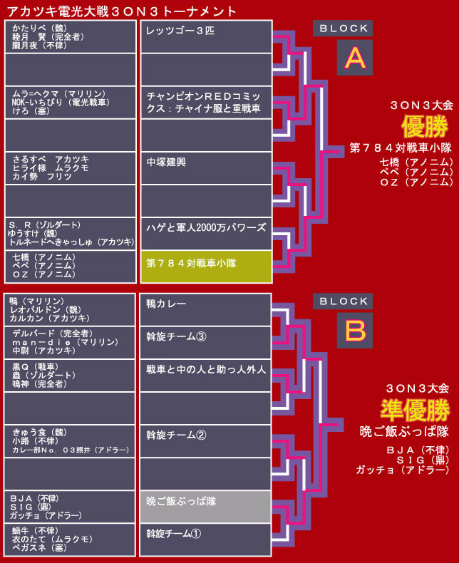大将の「七橋」を温存したまま、「oz」は準決勝の試合から合わせ6人抜きの快挙を成し遂げ、3on3はアノニム・アノニム・アノニムの異色の構成の【第784戦車小隊】が優勝を収めた。